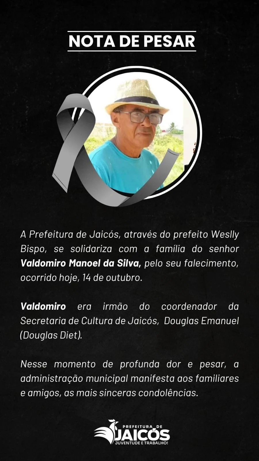 O prefeito Weslly Bispo divulgou nota de pesar, lamentando a perda e prestando solidariedade à família. Ele destacou que Valdomiro era irmão de Douglas Diet, coordenador da Secretaria Municipal de Cultura, e reforçou o sentimento de consternação que tomou conta da cidade diante da tragédia.